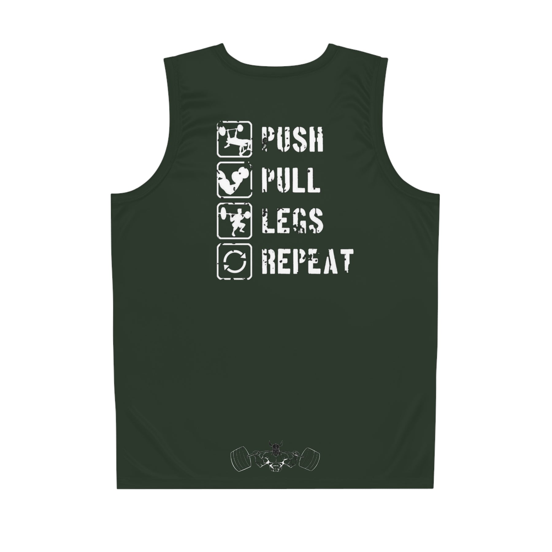 Master your routine with this motivational tank top. Its comfortable fit and bold "Push, Pull, Legs, Repeat" graphic inspire confidence and consistent performance every workout, Crafted with moisture-wicking material, it keeps you cool and dry during intense physical activities, The sleek design features motivational graphics perfect for fitness enthusiasts.