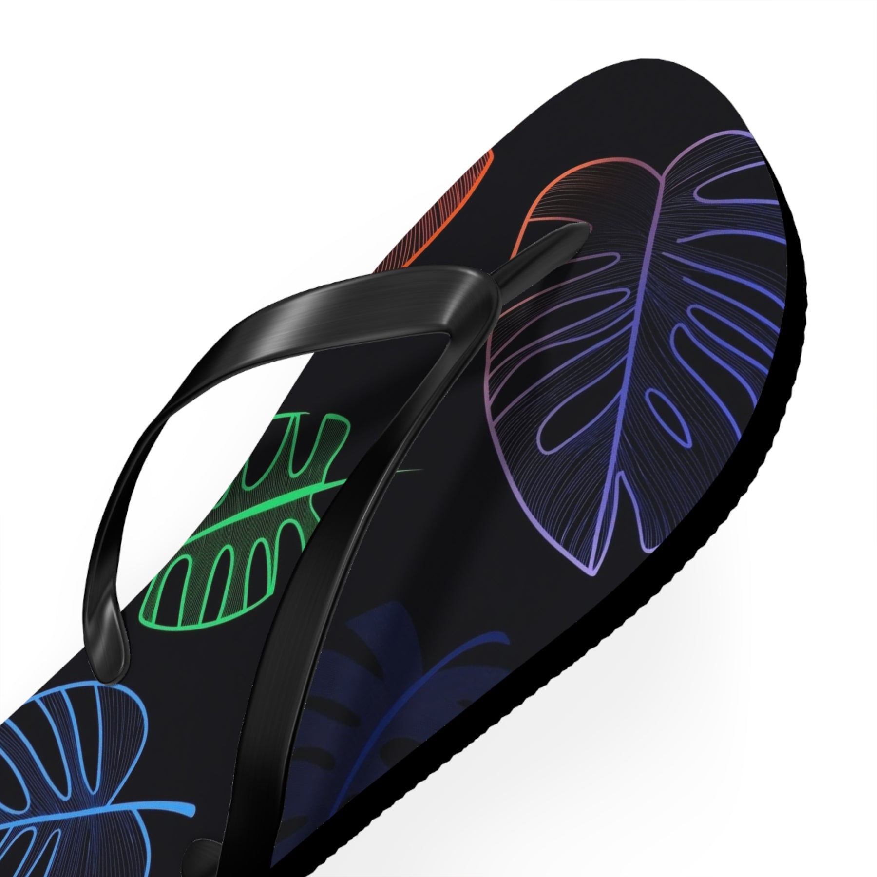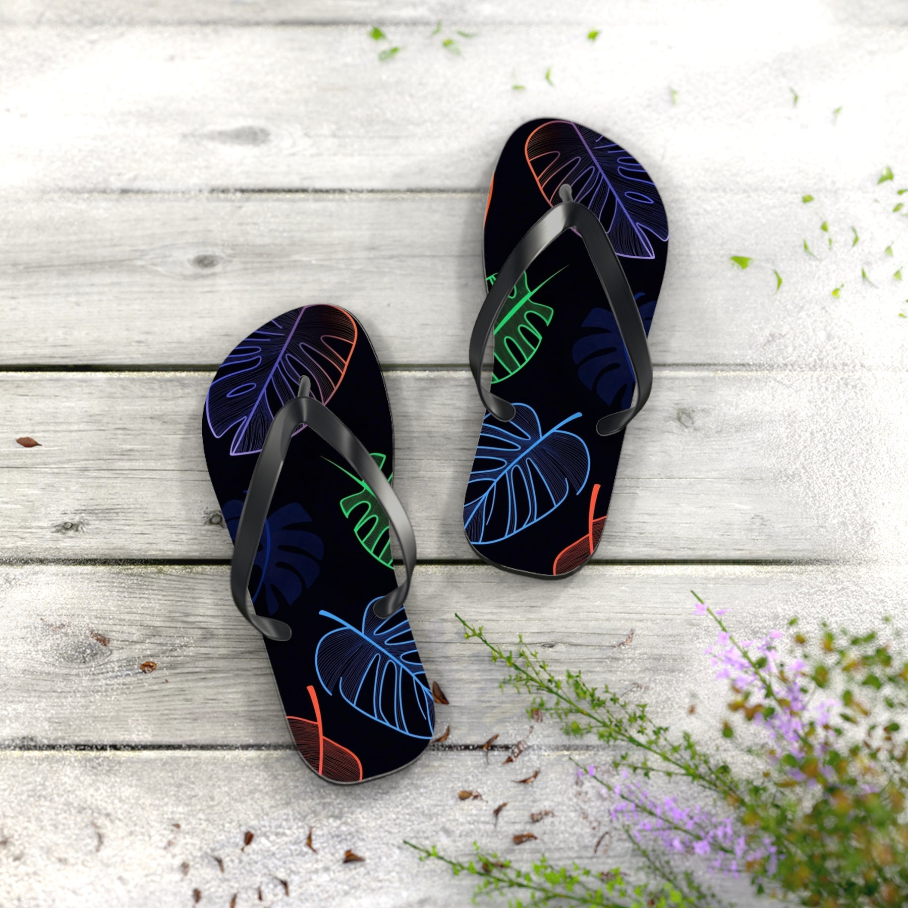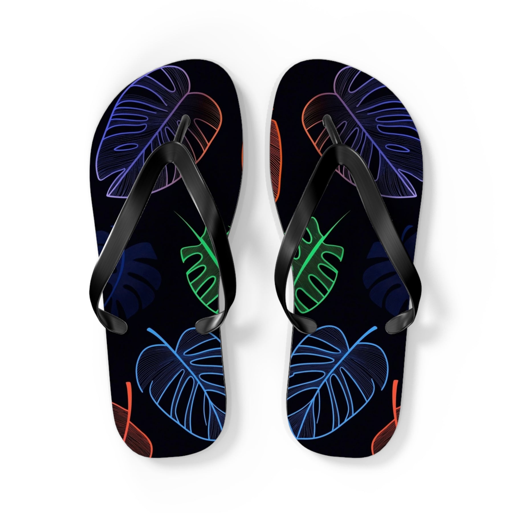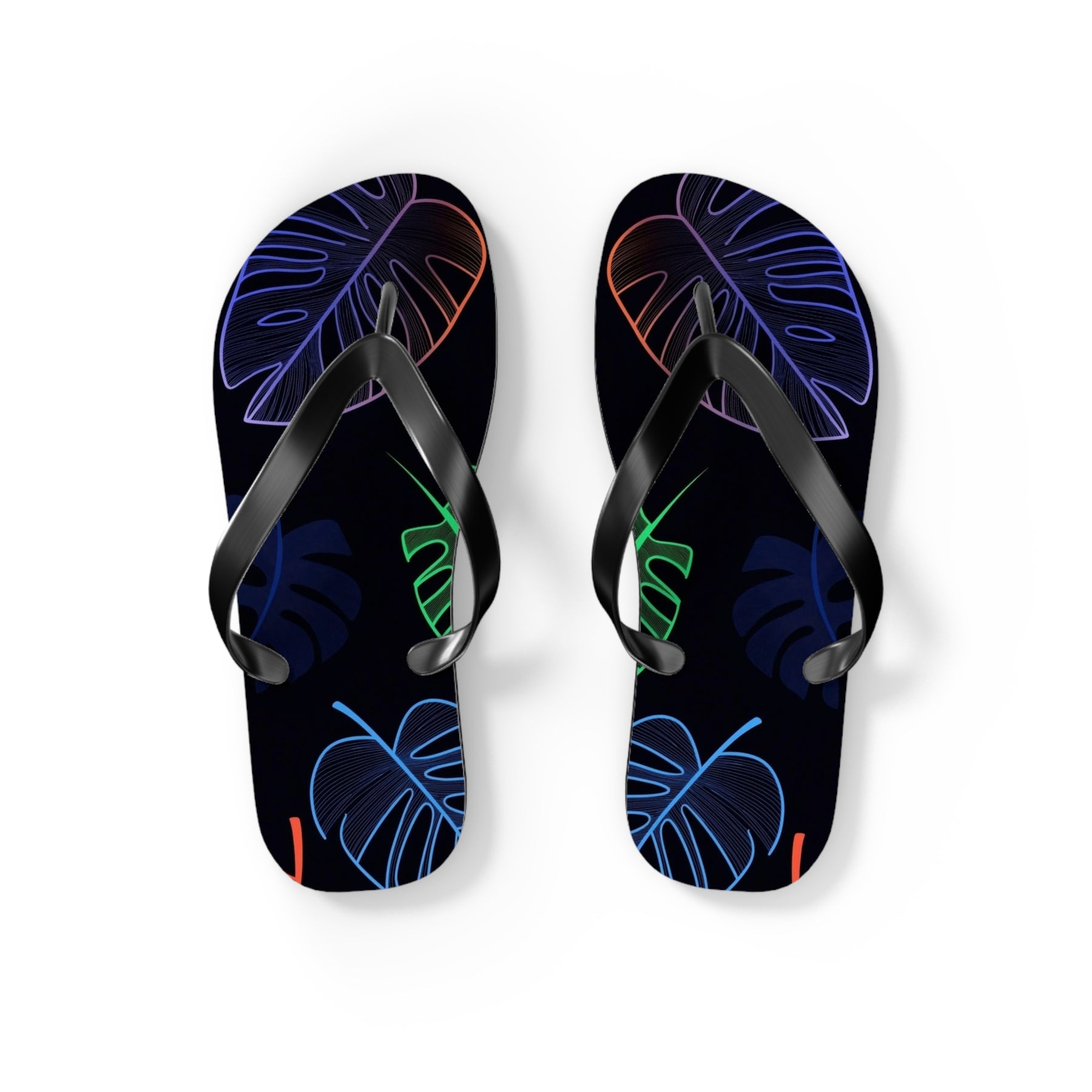 Escape to paradise with these vibrant tropical flip flops featuring bold neon leaf prints perfect for beach lovers and vacation enthusiasts. Bring the tropics to every step you take.